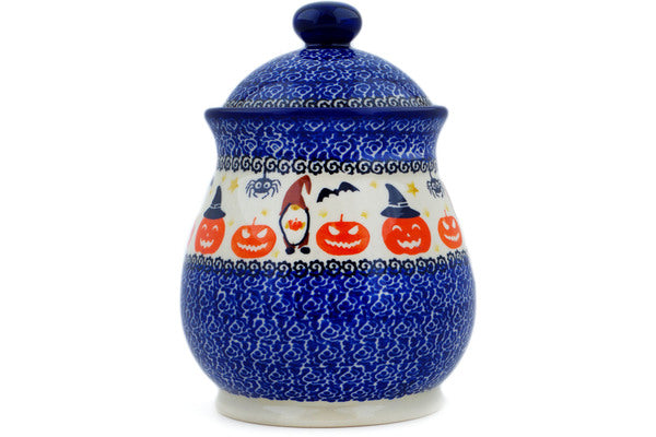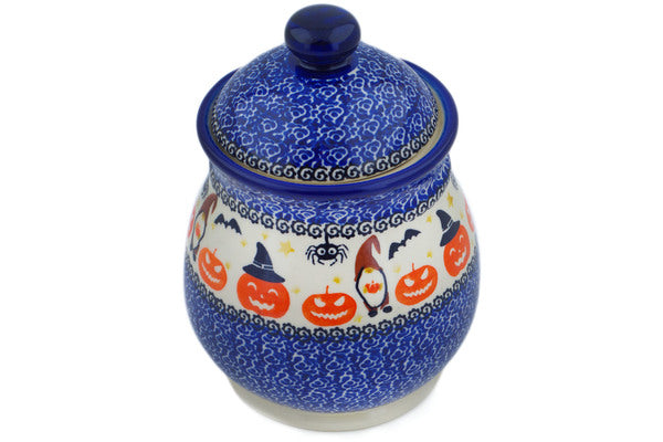 This Polish Pottery Jar with Lid is handmade and handpainted by the Ceramika Nina factory in Boleslawiec, Poland. Manufacturer item number H1426P. It is 8" high and measures 7" by 6". The capacity of this Jar with Lid is 46.33 oz (brimful) and it weighs 2.9 lbs. It is part of the Harvest Haunt Collection.