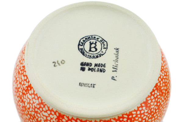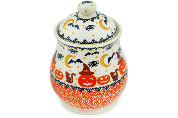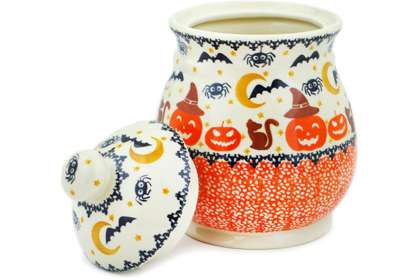 This Polish Pottery Jar with Lid is handmade and handpainted by the Ceramika Bona factory in Boleslawiec, Poland. Manufacturer item number H9046N. It is 8" high and measures 7" by 6". The capacity of this Jar with Lid is 46.33 oz (brimful) and it weighs 2.9 lbs. It is part of the Halloween Spooky Pumpkin Collection.