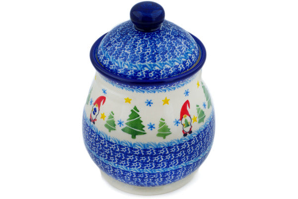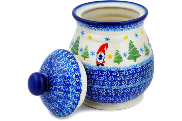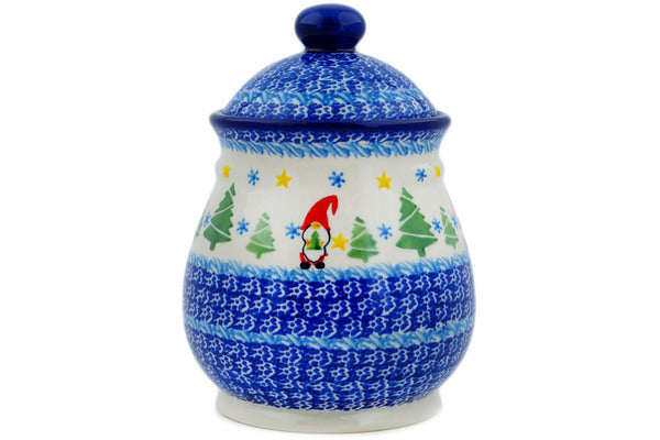 This Polish Pottery Jar with Lid is handmade and handpainted by the Ceramika Nina factory in Boleslawiec, Poland. Manufacturer item number H1553P. It is 8" high and measures 7" by 6". The capacity of this Jar with Lid is 46.33 oz (brimful) and it weighs 2.9 lbs. It is part of the Twinkle Twinkle Little Gnome Collection.