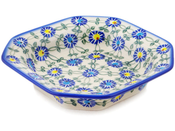 This Polish Pottery Octagonal Bowl is handmade and handpainted by the Ceramika Bona factory in Boleslawiec, Poland. Manufacturer item number H2206R. It is 1¾" high and measures 8½" by 7¾". The capacity of this Octagonal Bowl is 9.13 oz (brimful) and it weighs 1.6 lbs. It is part of the Blue Thistle Beauty Collection.