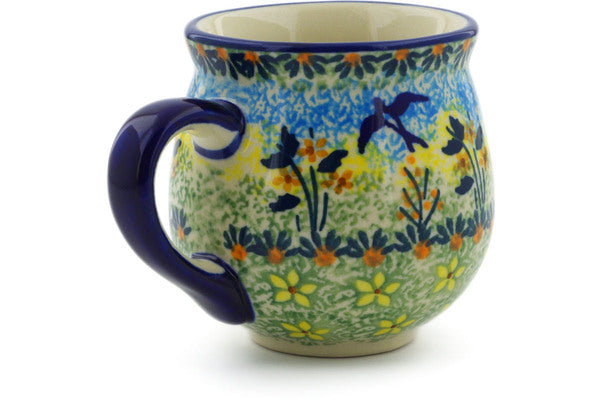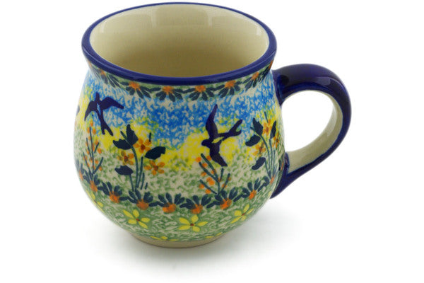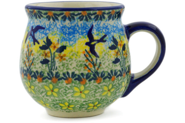 This Polish Pottery Bubble Mug is handmade and handpainted by the Manufaktura factory in Boleslawiec, Poland. Manufacturer item number H9909J. It is 3¼" high and measures 4¼" by 3¼". The capacity of this Bubble Mug is 8.45 oz (brimful) and it weighs 0.5 lbs. It is part of the Birds In The Sunset Collection.