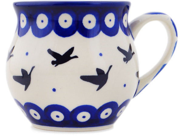 This Polish Pottery Bubble Mug is handmade and handpainted by the Ceramika Bona factory in Boleslawiec, Poland. Manufacturer item number H9929Q. It is 3" high and measures 4" by 2¾". The capacity of this Bubble Mug is 7.78 oz (brimful) and it weighs 0.5 lbs. It is part of the Blue Eye Heron Collection.