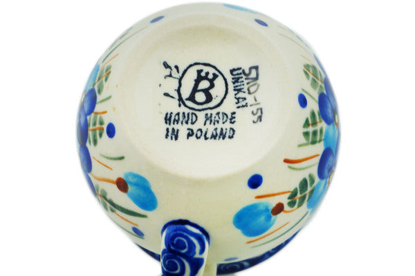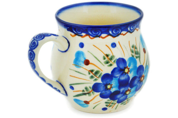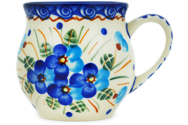 This Polish Pottery Bubble Mug is handmade and handpainted by the Ceramika Bona factory in Boleslawiec, Poland. Manufacturer item number H2945N. It is 3" high and measures 4" by 2¾". The capacity of this Bubble Mug is 7.78 oz (brimful) and it weighs 0.5 lbs. It is part of the Blue Pansy Collection.