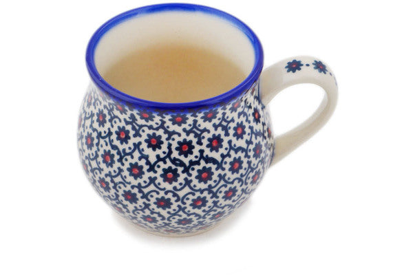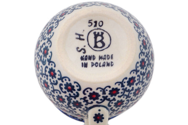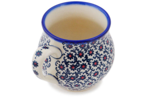 This Polish Pottery Bubble Mug is handmade and handpainted by the Ceramika Bona factory in Boleslawiec, Poland. Manufacturer item number H9680Q. It is 3" high and measures 4" by 2¾". The capacity of this Bubble Mug is 7.78 oz (brimful) and it weighs 0.5 lbs. It is part of the Field Of Black Daisies Collection.