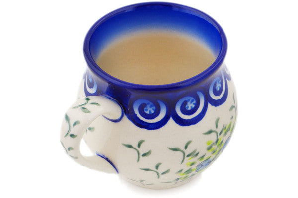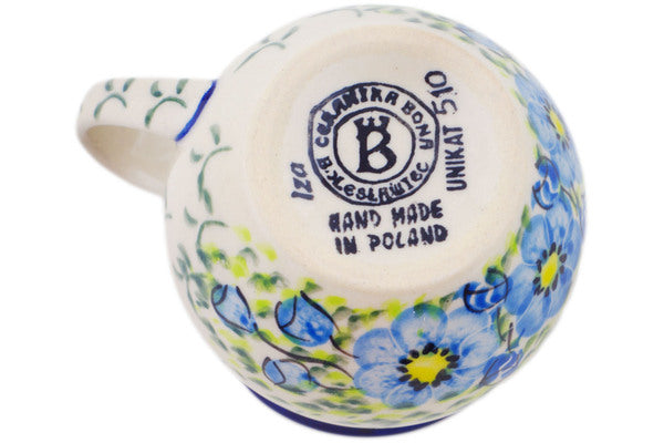 This Polish Pottery Bubble Mug is handmade and handpainted by the Ceramika Bona factory in Boleslawiec, Poland. Manufacturer item number H1847R. It is 3" high and measures 4" by 2¾". The capacity of this Bubble Mug is 7.78 oz (brimful) and it weighs 0.5 lbs. It is part of the Gorgeous Morning Glory Collection.