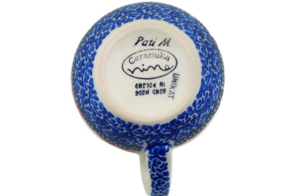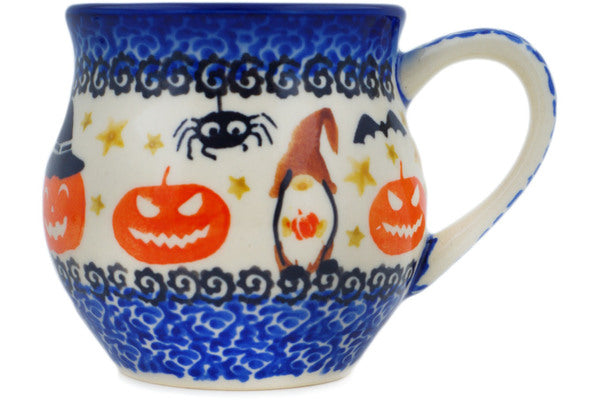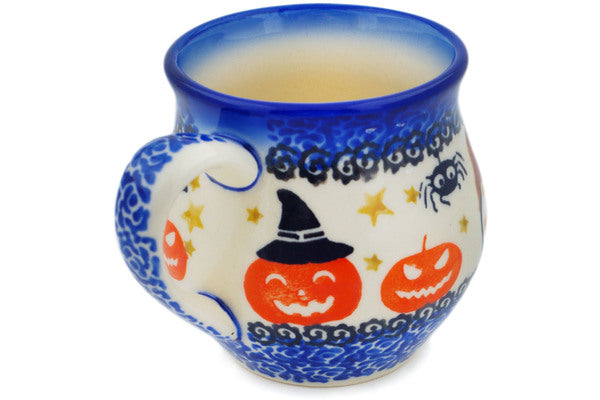 This Polish Pottery Bubble Mug is handmade and handpainted by the Ceramika Nina factory in Boleslawiec, Poland. Manufacturer item number H1563P. It is 3" high and measures 4" by 2¾". The capacity of this Bubble Mug is 7.78 oz (brimful) and it weighs 0.5 lbs. It is part of the Harvest Haunt Collection.