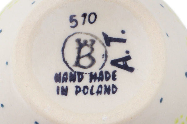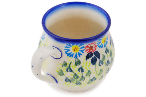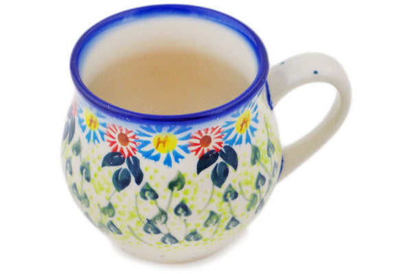 This Polish Pottery Bubble Mug is handmade and handpainted by the Ceramika Bona factory in Boleslawiec, Poland. Manufacturer item number H1846R. It is 3" high and measures 4" by 2¾". The capacity of this Bubble Mug is 7.78 oz (brimful) and it weighs 0.5 lbs. It is part of the Long-stemmed Beauties Collection.