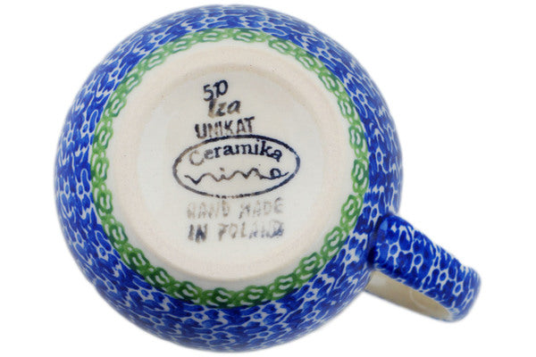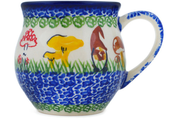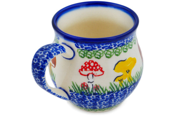 This Polish Pottery Bubble Mug is handmade and handpainted by the Ceramika Nina factory in Boleslawiec, Poland. Manufacturer item number H1510P. It is 3" high and measures 4" by 2¾". The capacity of this Bubble Mug is 7.78 oz (brimful) and it weighs 0.5 lbs. It is part of the Mushroom Garden Collection.