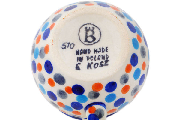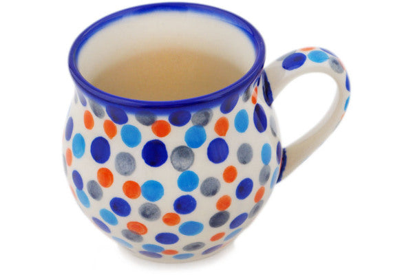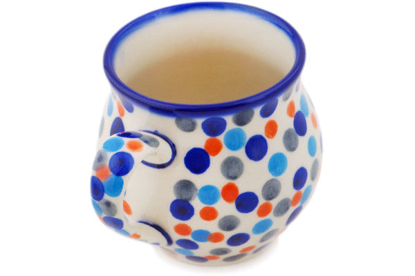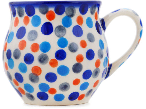 This Polish Pottery Bubble Mug is handmade and handpainted by the Ceramika Bona factory in Boleslawiec, Poland. Manufacturer item number H2023R. It is 3" high and measures 4" by 2¾". The capacity of this Bubble Mug is 7.78 oz (brimful) and it weighs 0.5 lbs. It is part of the Polka Dot Frenzy Collection.