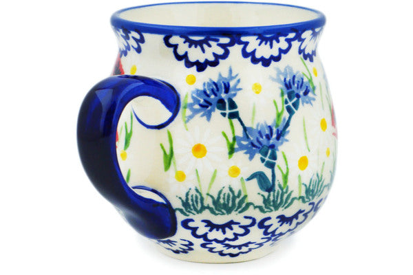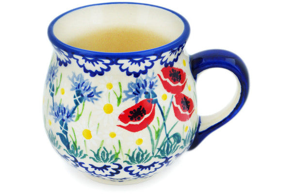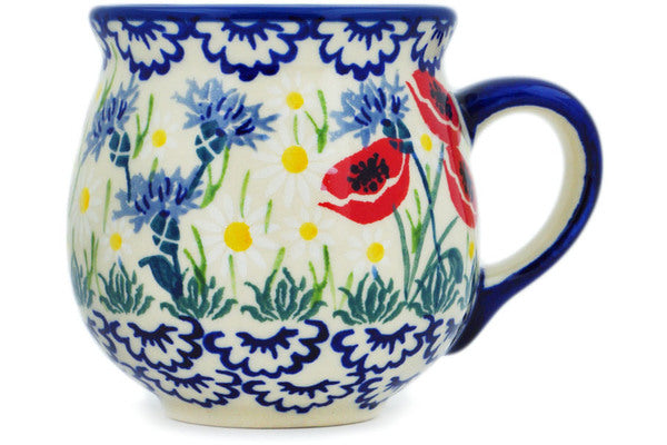 This Polish Pottery Bubble Mug is handmade and handpainted by the Manufaktura factory in Boleslawiec, Poland. Manufacturer item number H4609M. It is 3¼" high and measures 4¼" by 3¼". The capacity of this Bubble Mug is 8.45 oz (brimful) and it weighs 0.5 lbs. It is part of the Poppies and Cornflowers Collection.