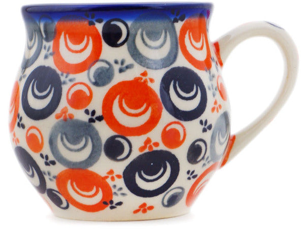 This Polish Pottery Bubble Mug is handmade and handpainted by the Ceramika Bona factory in Boleslawiec, Poland. Manufacturer item number H7156Q. It is 3" high and measures 4" by 2¾". The capacity of this Bubble Mug is 7.78 oz (brimful) and it weighs 0.5 lbs. It is part of the Red Peacock Eye Collection.
