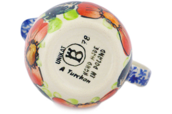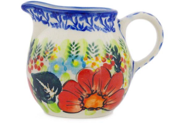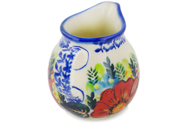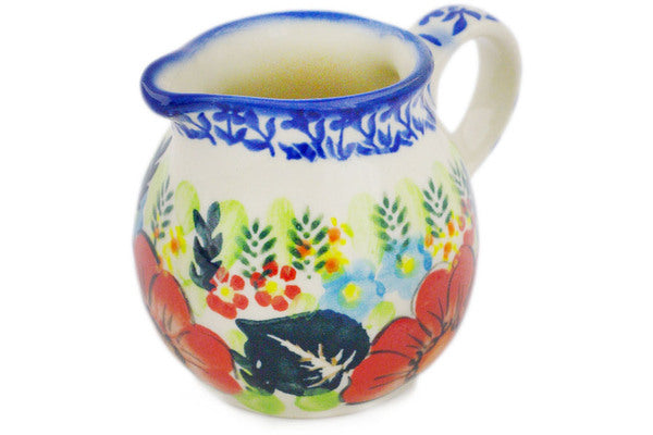 This Polish Pottery Creamer is handmade and handpainted by the Ceramika Bona factory in Boleslawiec, Poland. Manufacturer item number H6437F. It is 3¼" high and measures 4¼" by 3". The capacity of this Creamer is 8.45 oz (brimful) and it weighs 0.4 lbs. It is part of the Bold Red Poppies Collection.