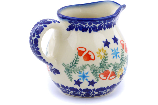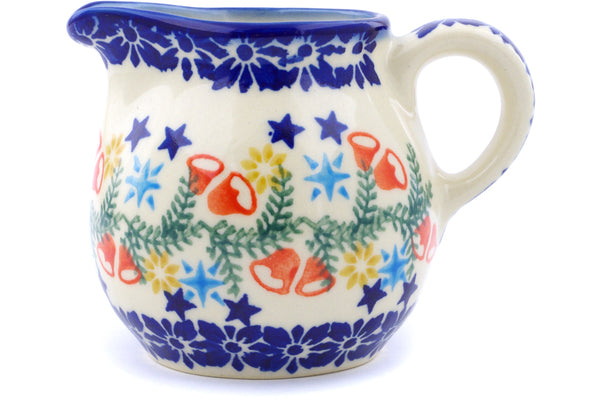 This Polish Pottery Creamer is handmade and handpainted by the Ceramika Bona factory in Boleslawiec, Poland. Manufacturer item number H1298J. It is 3¼" high and measures 4¼" by 3". The capacity of this Creamer is 8.45 oz (brimful) and it weighs 0.4 lbs. It is part of the Wreath Of Bells Collection.