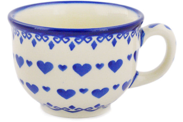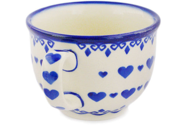 This Polish Pottery Cup is handmade and handpainted by the Ceramika Bona factory in Boleslawiec, Poland. Manufacturer item number H3813I. It is 2¾" high and measures 5" by 3¾". The capacity of this Cup is 7.71 oz (brimful) and it weighs 0.5 lbs. It is part of the Blue Valentine Hearts Collection.