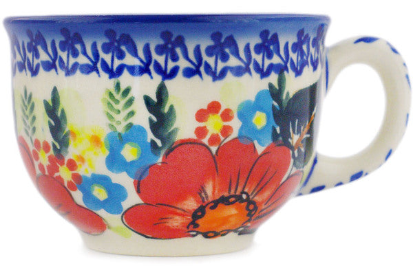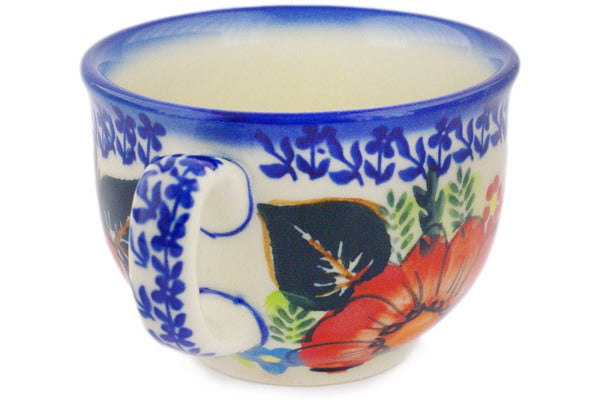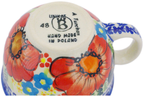 This Polish Pottery Cup is handmade and handpainted by the Ceramika Bona factory in Boleslawiec, Poland. Manufacturer item number H2155G. It is 2¾" high and measures 5" by 3¾". The capacity of this Cup is 7.71 oz (brimful) and it weighs 0.5 lbs. It is part of the Bold Red Poppies Collection.