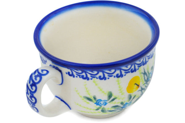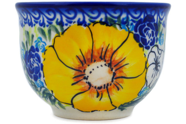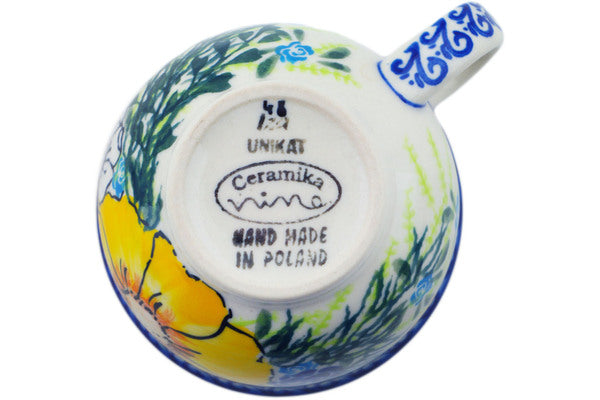 This Polish Pottery Cup is handmade and handpainted by the Ceramika Nina factory in Boleslawiec, Poland. Manufacturer item number H9729N. It is 2¾" high and measures 5" by 3¾". The capacity of this Cup is 7.71 oz (brimful) and it weighs 0.5 lbs. It is part of the Bright Blooms Collection.