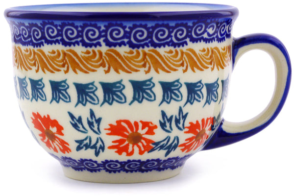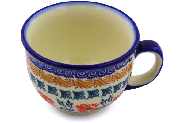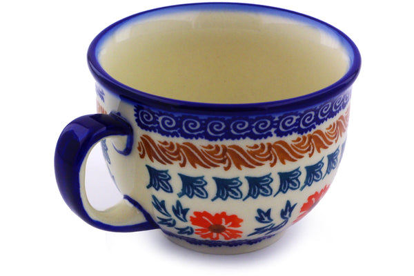 This Polish Pottery Cup is handmade and handpainted by the Ceramika Bona factory in Boleslawiec, Poland. Manufacturer item number H9887I. It is 2¾" high and measures 5" by 3¾". The capacity of this Cup is 7.71 oz (brimful) and it weighs 0.5 lbs. It is part of the Red Cornflower Collection.