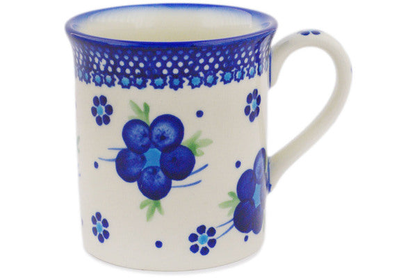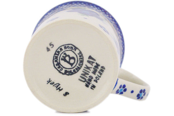 This Polish Pottery Mug is handmade and handpainted by the Ceramika Bona factory in Boleslawiec, Poland. Manufacturer item number H0352C. It is 3½" high and measures 4½" by 3¼". The capacity of this Mug is 8.45 oz (brimful) and it weighs 0.7 lbs. It is part of the Bleu-Belle Fleur Collection.