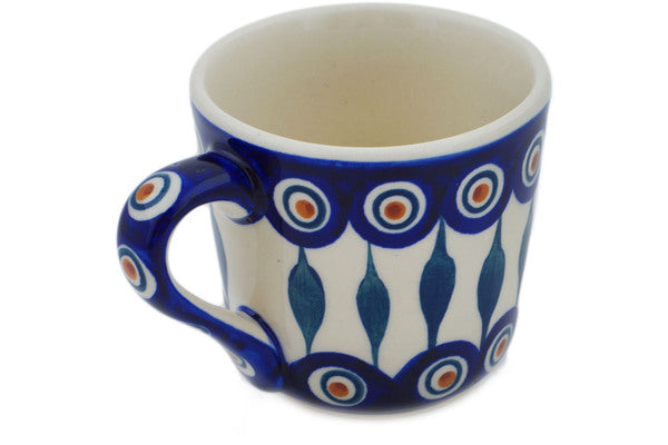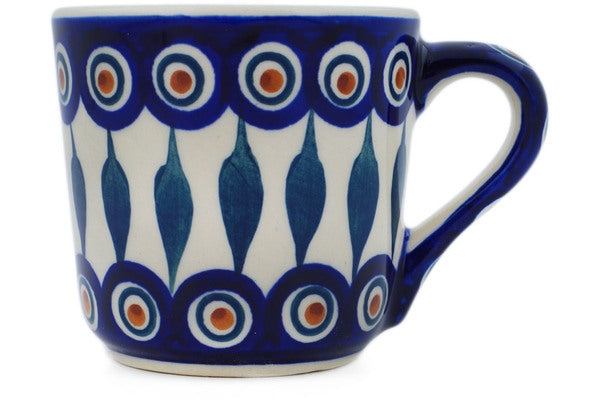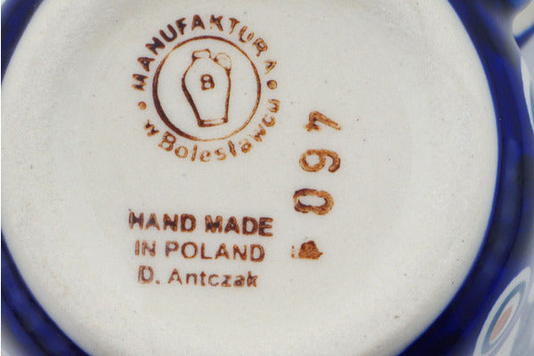 This Polish Pottery Mug is handmade and handpainted by the Manufaktura factory in Boleslawiec, Poland. Manufacturer item number H0618O. It is 3" high and measures 4¼" by 3¼". The capacity of this Mug is 7.91 oz (brimful) and it weighs 0.5 lbs. It is part of the Peacock Collection.