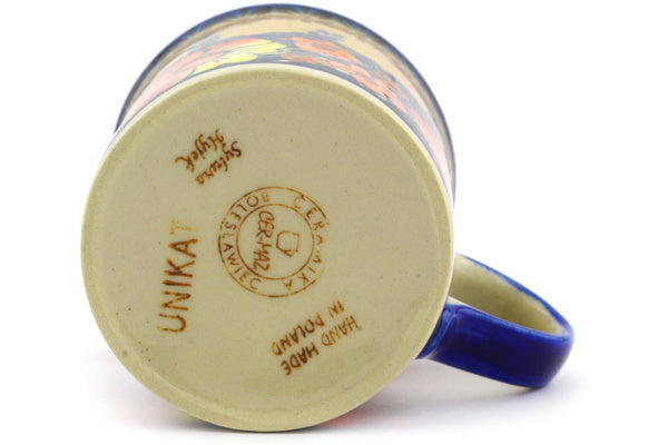 This is a Polish pottery Unikat (Signature) Mug, which means that it has been hand painted with both sponges and brushes and it is signed by the artist who painted it. Unikat pieces are the most intricate works of art. Larger Unikat items take hours of very careful work to finish.
