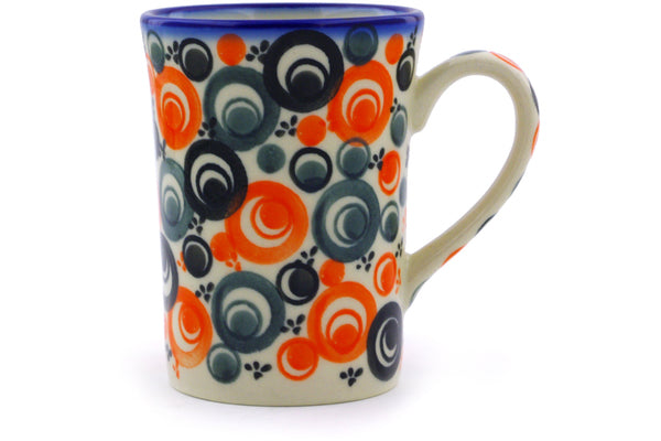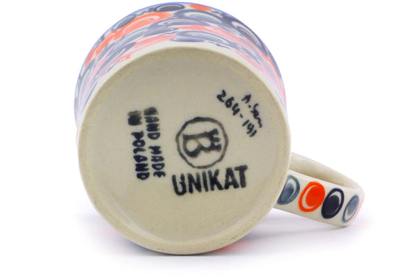 This Polish Pottery Mug is handmade and handpainted by the Ceramika Bona factory in Boleslawiec, Poland. Manufacturer item number H9764I. It is 4" high and measures 4¼" by 3". The capacity of this Mug is 7.91 oz (brimful) and it weighs 0.6 lbs. It is part of the Red Peacock Eye Collection.