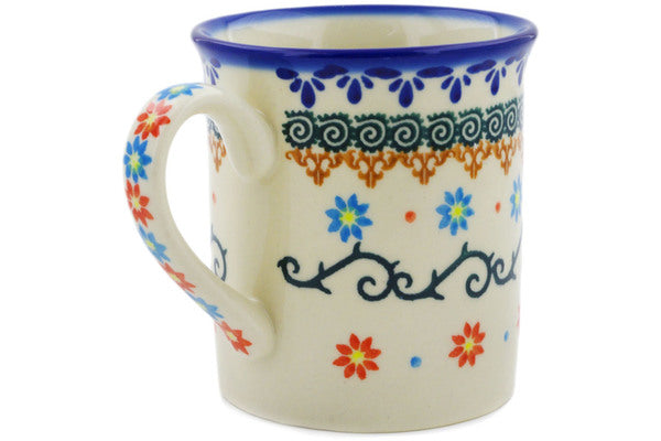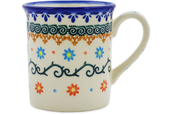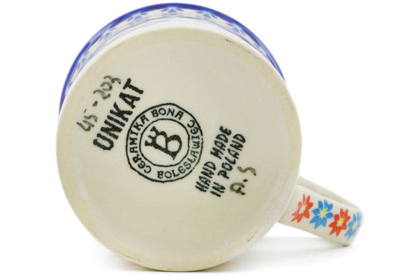 This Polish Pottery Mug is handmade and handpainted by the Ceramika Bona factory in Boleslawiec, Poland. Manufacturer item number H0459K. It is 3½" high and measures 4½" by 3¼". The capacity of this Mug is 8.45 oz (brimful) and it weighs 0.7 lbs. It is part of the Sunflower Dance Collection.