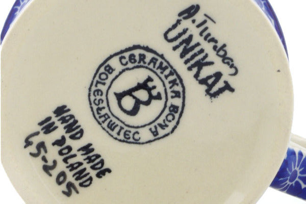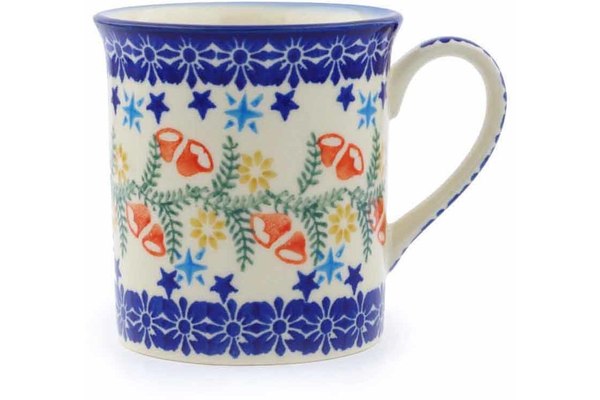 This Polish Pottery Mug is handmade and handpainted by the Ceramika Bona factory in Boleslawiec, Poland. Manufacturer item number H1231J. It is 3½" high and measures 4½" by 3¼". The capacity of this Mug is 8.45 oz (brimful) and it weighs 0.7 lbs. It is part of the Wreath Of Bells Collection.