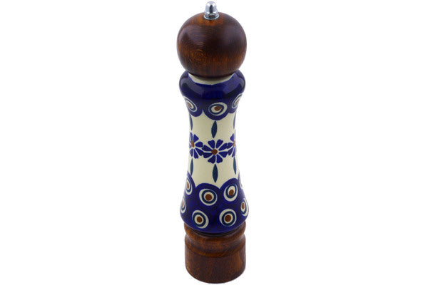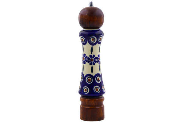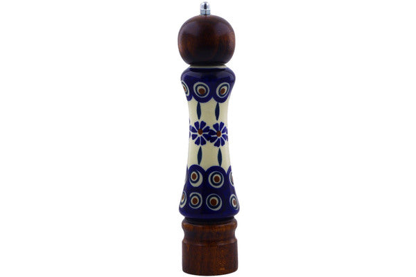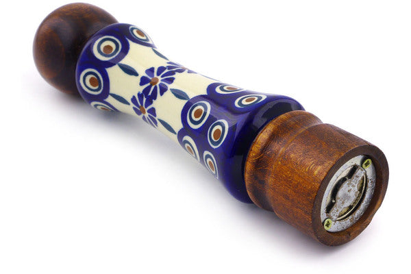 This Polish Pottery Grinder is handmade and handpainted by the Manufaktura factory in Boleslawiec, Poland. Manufacturer item number H9597I. It is 8½" high and measures 2" by 2". The weight of this Grinder is 0.5 lbs. It is part of the Peacock Collection.