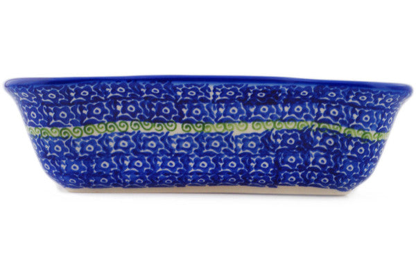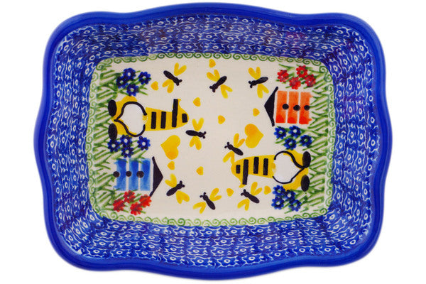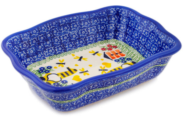 This Polish Pottery Rectangular Baker is handmade and handpainted by the Ceramika Nina factory in Boleslawiec, Poland. Manufacturer item number H3187P. It is 2" high and measures 8" by 6¼". The capacity of this Rectangular Baker is 24.55 oz (brimful) and it weighs 1.5 lbs. It is part of the Beekeeper Gnome Collection.
