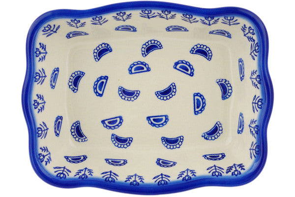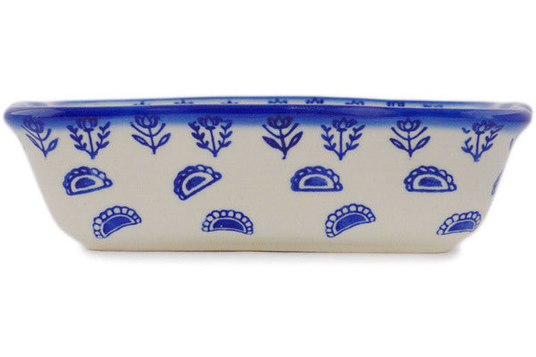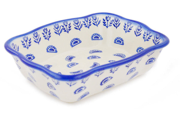 This Polish Pottery Rectangular Baker is handmade and handpainted by the Ceramika Bona factory in Boleslawiec, Poland. Manufacturer item number H4602R. It is 2" high and measures 8" by 6¼". The capacity of this Rectangular Baker is 24.55 oz (brimful) and it weighs 1.5 lbs. It is part of the Blue Pierogi Collection.