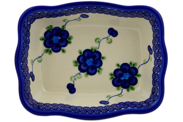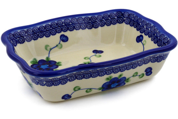 This Polish Pottery Rectangular Baker is handmade and handpainted by the Ceramika Bona factory in Boleslawiec, Poland. Manufacturer item number H7056J. It is 2" high and measures 8" by 6¼". The capacity of this Rectangular Baker is 24.55 oz (brimful) and it weighs 1.5 lbs. It is part of the Blue Poppies Collection.