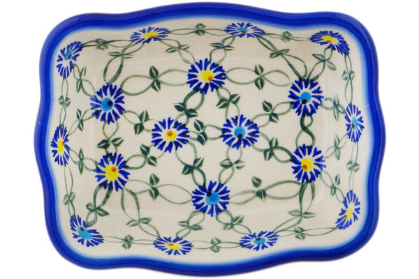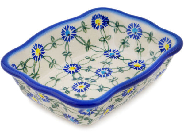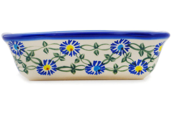 This Polish Pottery Rectangular Baker is handmade and handpainted by the Ceramika Bona factory in Boleslawiec, Poland. Manufacturer item number H1886R. It is 2" high and measures 8" by 6¼". The capacity of this Rectangular Baker is 24.55 oz (brimful) and it weighs 1.5 lbs. It is part of the Blue Thistle Beauty Collection.