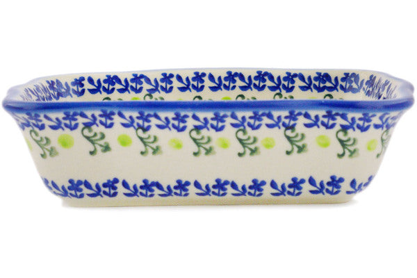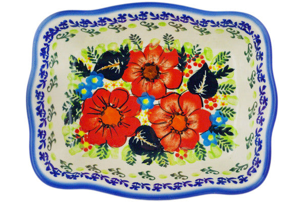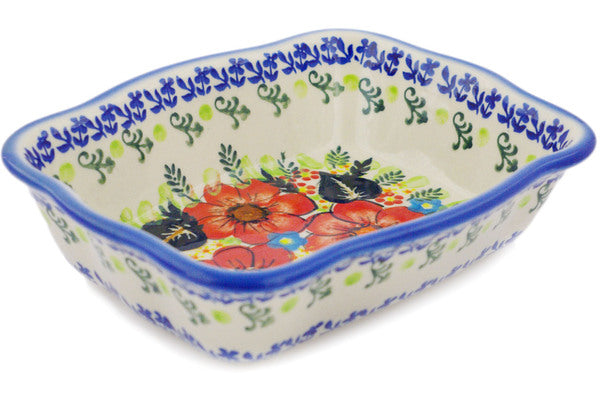 This Polish Pottery Rectangular Baker is handmade and handpainted by the Ceramika Bona factory in Boleslawiec, Poland. Manufacturer item number H6680R. It is 2" high and measures 8" by 6¼". The capacity of this Rectangular Baker is 24.55 oz (brimful) and it weighs 1.5 lbs. It is part of the Bold Red Poppies Collection.