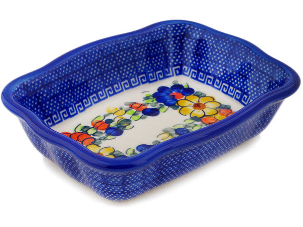This Polish Pottery Rectangular Baker is handmade and handpainted by the Ceramika Bona factory in Boleslawiec, Poland. Manufacturer item number H4013Q. It is 2" high and measures 8" by 6¼". The capacity of this Rectangular Baker is 24.55 oz (brimful) and it weighs 1.5 lbs. It is part of the Fall Garden Collection.
