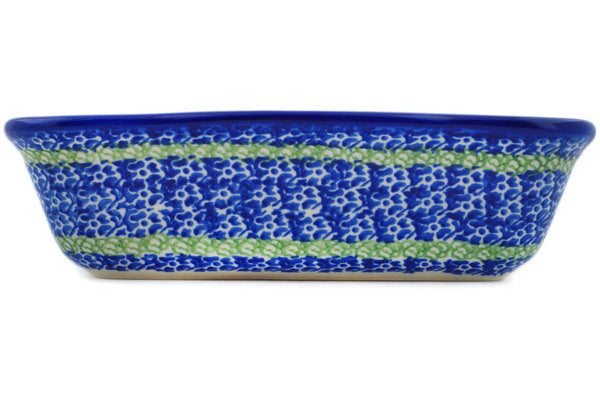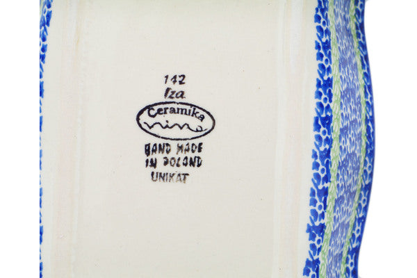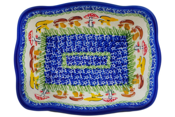 This Polish Pottery Rectangular Baker is handmade and handpainted by the Ceramika Nina factory in Boleslawiec, Poland. Manufacturer item number H1584P. It is 2" high and measures 8" by 6¼". The capacity of this Rectangular Baker is 24.55 oz (brimful) and it weighs 1.5 lbs. It is part of the Wild Mushroom Picking Collection.