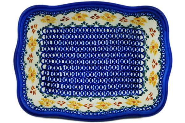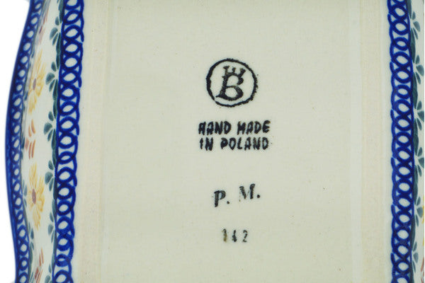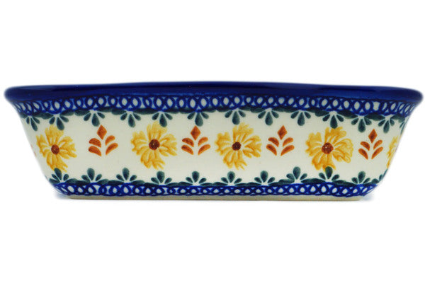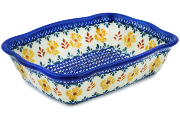 This Polish Pottery Rectangular Baker is handmade and handpainted by the Ceramika Bona factory in Boleslawiec, Poland. Manufacturer item number H6060N. It is 2" high and measures 8" by 6¼". The capacity of this Rectangular Baker is 24.55 oz (brimful) and it weighs 1.5 lbs. It is part of the Golden Flower Garden Collection.