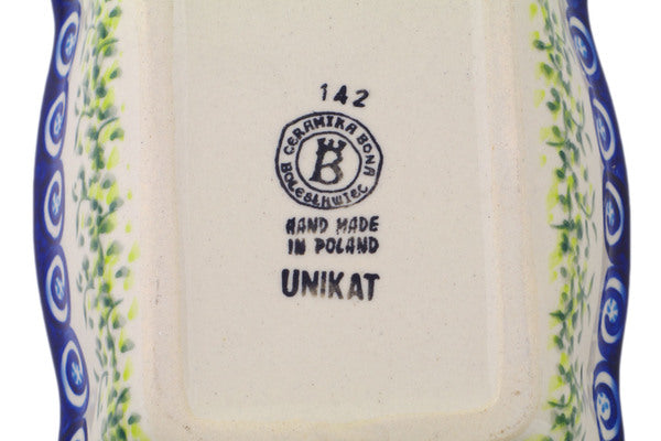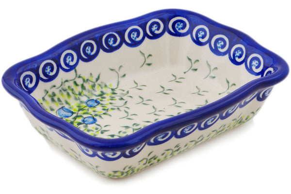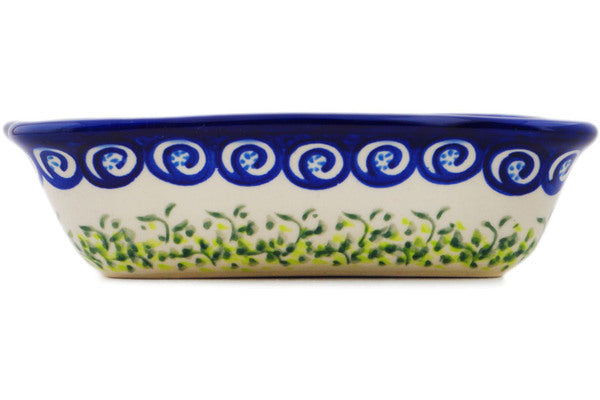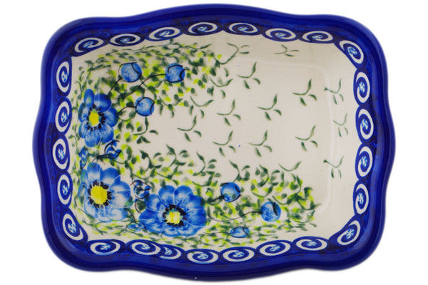 This Polish Pottery Rectangular Baker is handmade and handpainted by the Ceramika Bona factory in Boleslawiec, Poland. Manufacturer item number H2072R. It is 2" high and measures 8" by 6¼". The capacity of this Rectangular Baker is 24.55 oz (brimful) and it weighs 1.5 lbs. It is part of the Gorgeous Morning Glory Collection.
