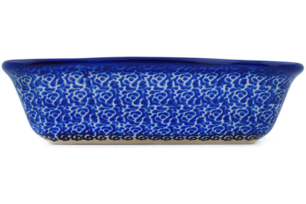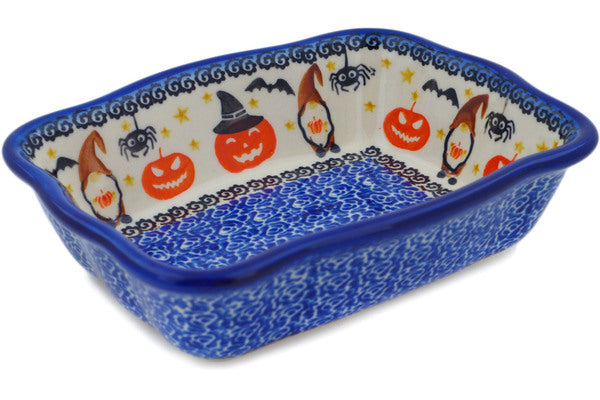 This Polish Pottery Rectangular Baker is handmade and handpainted by the Ceramika Nina factory in Boleslawiec, Poland. Manufacturer item number H1364P. It is 2" high and measures 8" by 6¼". The capacity of this Rectangular Baker is 24.55 oz (brimful) and it weighs 1.5 lbs. It is part of the Harvest Haunt Collection.
