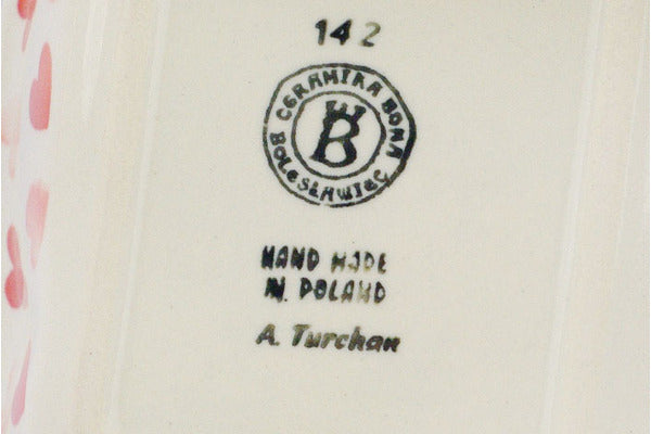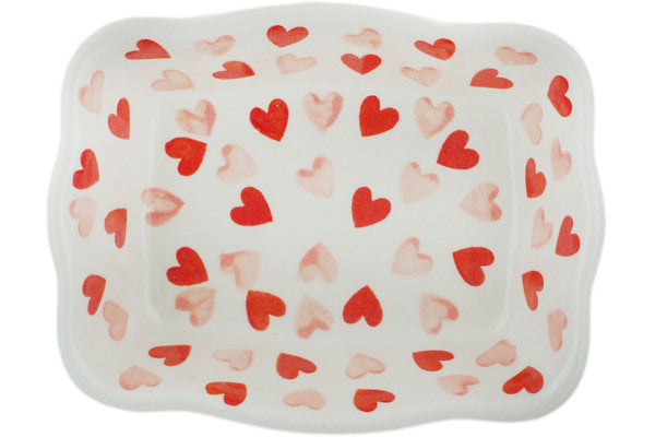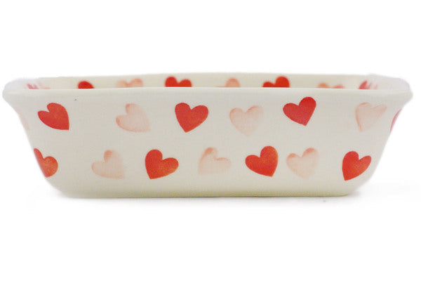 This Polish Pottery Rectangular Baker is handmade and handpainted by the Ceramika Bona factory in Boleslawiec, Poland. Manufacturer item number H4601R. It is 2" high and measures 8" by 6¼". The capacity of this Rectangular Baker is 24.55 oz (brimful) and it weighs 1.5 lbs. It is part of the Loving You Collection.