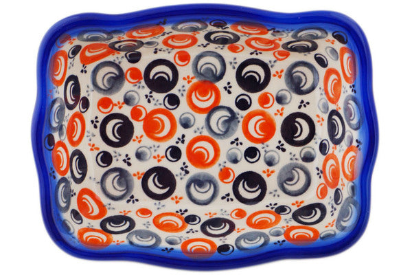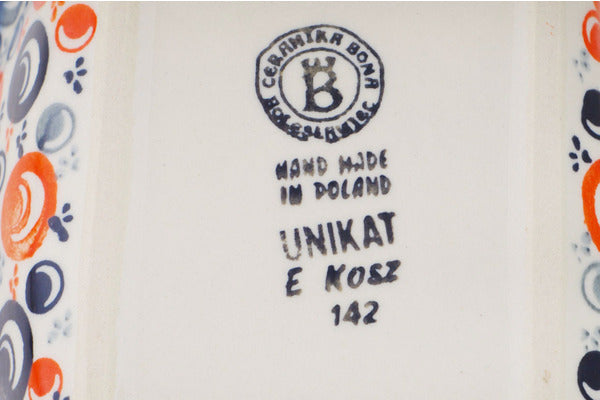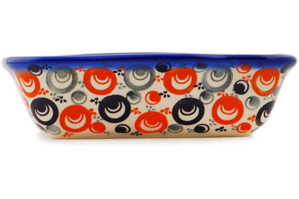 This Polish Pottery Rectangular Baker is handmade and handpainted by the Ceramika Bona factory in Boleslawiec, Poland. Manufacturer item number H7136Q. It is 2" high and measures 8" by 6¼". The capacity of this Rectangular Baker is 24.55 oz (brimful) and it weighs 1.5 lbs. It is part of the Red Peacock Eye Collection.