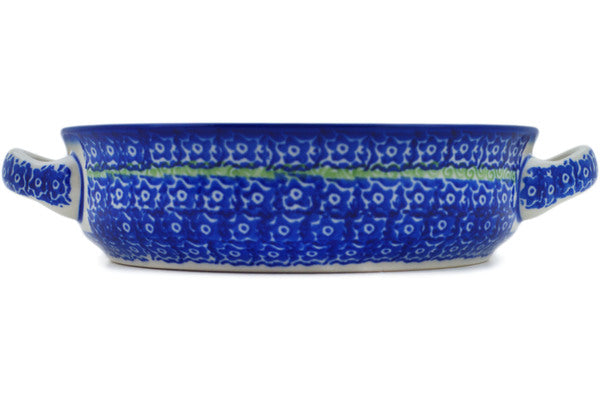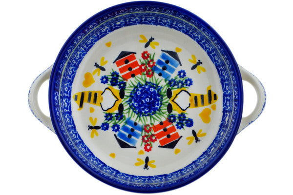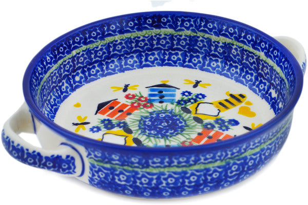 This Polish Pottery Round Baker with Handles is handmade and handpainted by the Ceramika Nina factory in Boleslawiec, Poland. Manufacturer item number H1628P. It is 1¾" high and measures 8¼" by 6½". The capacity of this Round Baker with Handles is 16.84 oz (brimful) and it weighs 1.0 lbs. It is part of the Beekeeper Gnome Collection.
