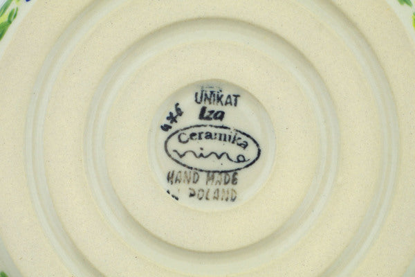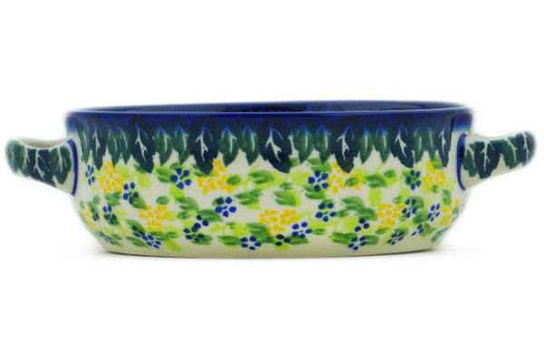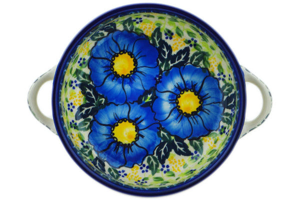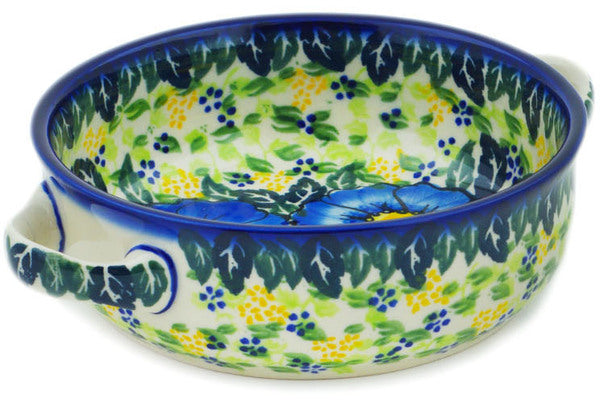 This Polish Pottery Round Baker with Handles is handmade and handpainted by the Ceramika Nina factory in Boleslawiec, Poland. Manufacturer item number H0294P. It is 2¼" high and measures 8" by 6½". The capacity of this Round Baker with Handles is 23.97 oz (brimful) and it weighs 1.1 lbs. It is part of the Blue Happy Fields Collection.
