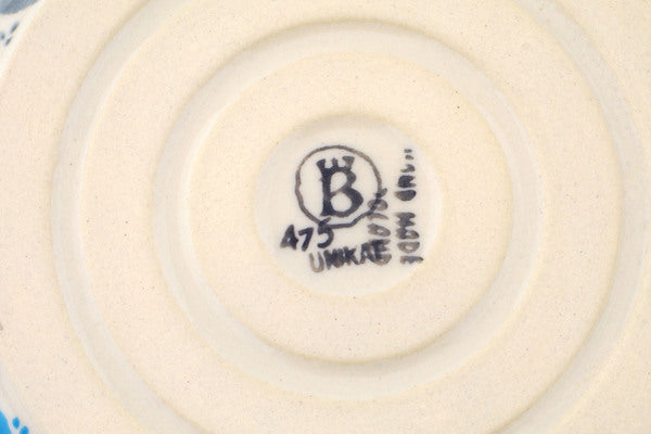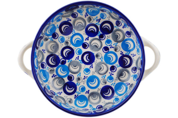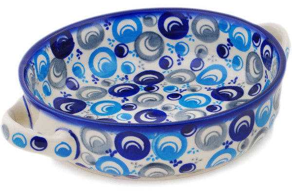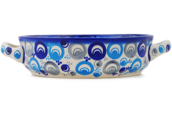 This Polish Pottery Round Baker with Handles is handmade and handpainted by the Ceramika Bona factory in Boleslawiec, Poland. Manufacturer item number H1063R. It is 1¾" high and measures 8¼" by 6½". The capacity of this Round Baker with Handles is 16.84 oz (brimful) and it weighs 1.0 lbs. It is part of the Blue Peacock Eye Collection.