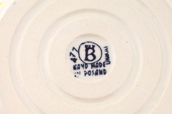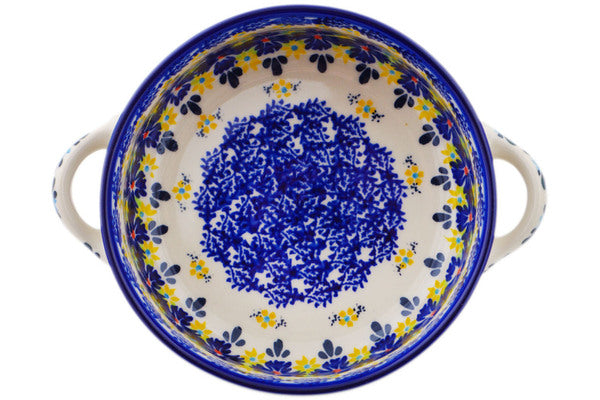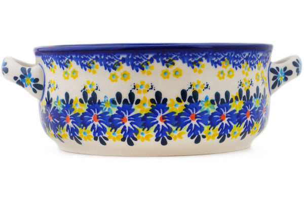 This Polish Pottery Round Baker with Handles is handmade and handpainted by the Ceramika Bona factory in Boleslawiec, Poland. Manufacturer item number H8715Q. It is 2¾" high and measures 8¼" by 6½". The capacity of this Round Baker with Handles is 30.77 oz (brimful) and it weighs 1.3 lbs. It is part of the Cornflower Meadow Collection.