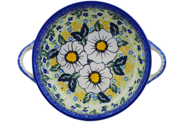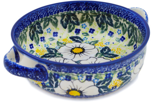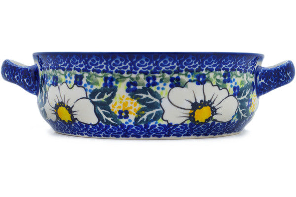 This Polish Pottery Round Baker with Handles is handmade and handpainted by the Ceramika Nina factory in Boleslawiec, Poland. Manufacturer item number H4827O. It is 2¼" high and measures 8" by 6½". The capacity of this Round Baker with Handles is 23.97 oz (brimful) and it weighs 1.1 lbs. It is part of the Floral Fantasy Collection.
