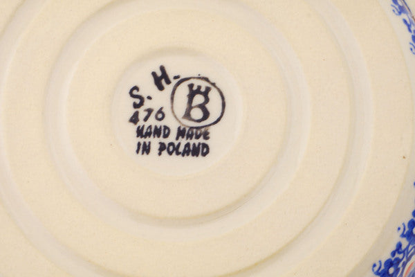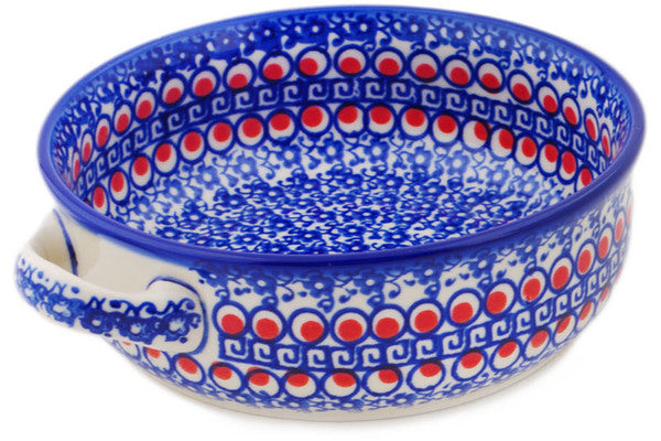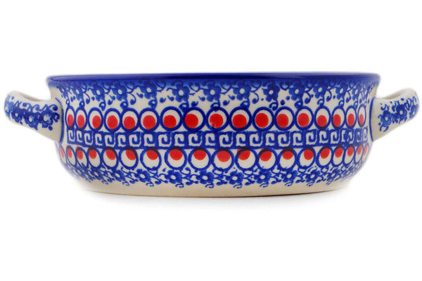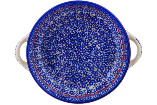 This Polish Pottery Round Baker with Handles is handmade and handpainted by the Ceramika Bona factory in Boleslawiec, Poland. Manufacturer item number H6865P. It is 2¼" high and measures 8" by 6½". The capacity of this Round Baker with Handles is 23.97 oz (brimful) and it weighs 1.1 lbs. It is part of the Floral Peacock Collection.