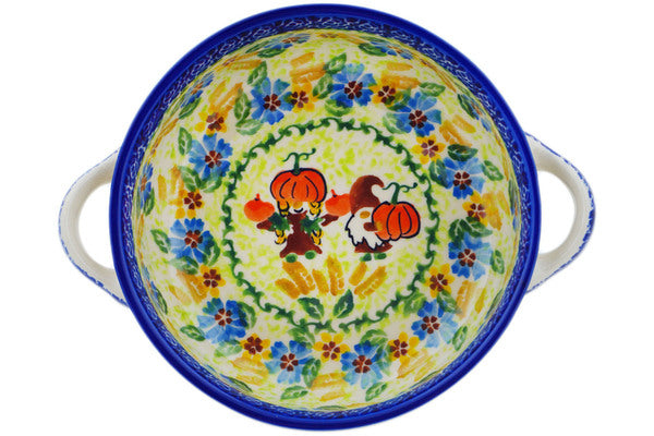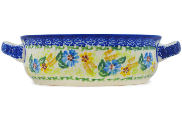 This Polish Pottery Round Baker with Handles is handmade and handpainted by the Ceramika Nina factory in Boleslawiec, Poland. Manufacturer item number H3092P. It is 2¼" high and measures 8" by 6½". The capacity of this Round Baker with Handles is 23.97 oz (brimful) and it weighs 1.1 lbs. It is part of the Gnomeo And Juliet Collection.