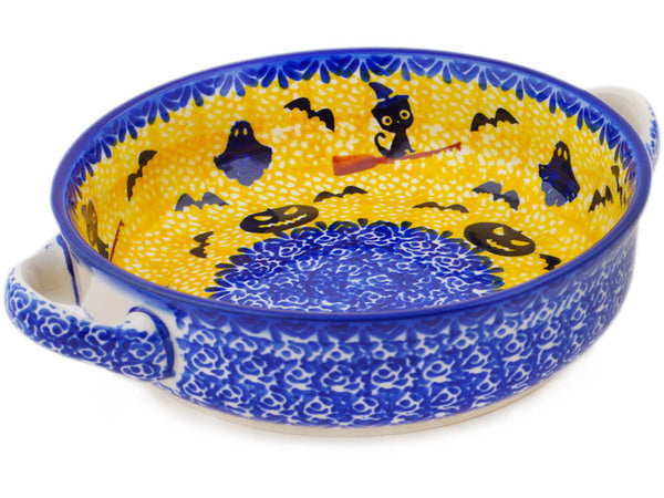 This Polish Pottery Round Baker with Handles is handmade and handpainted by the Ceramika Nina factory in Boleslawiec, Poland. Manufacturer item number H3394P. It is 1¾" high and measures 8¼" by 6½". The capacity of this Round Baker with Handles is 16.84 oz (brimful) and it weighs 1.0 lbs. It is part of the Halloween Evening Collection.