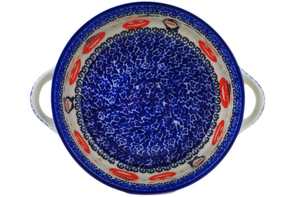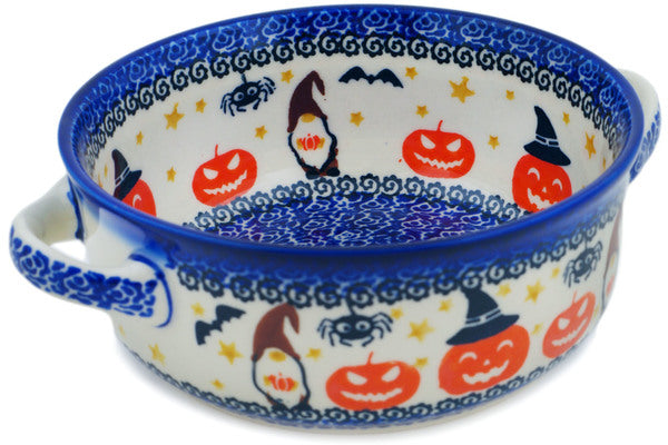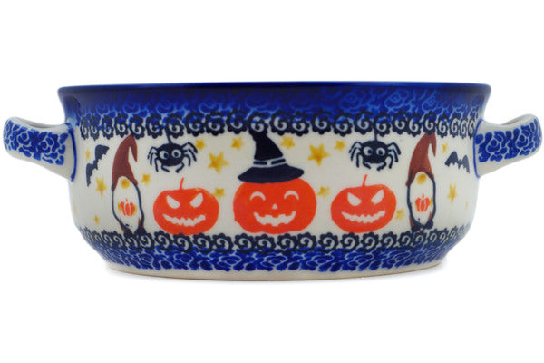 This Polish Pottery Round Baker with Handles is handmade and handpainted by the Ceramika Nina factory in Boleslawiec, Poland. Manufacturer item number H1532P. It is 2¾" high and measures 8¼" by 6½". The capacity of this Round Baker with Handles is 30.77 oz (brimful) and it weighs 1.3 lbs. It is part of the Harvest Haunt Collection.