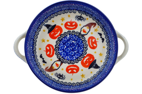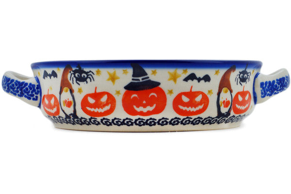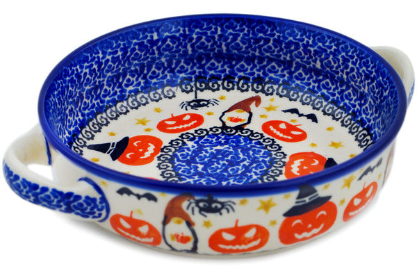 This Polish Pottery Round Baker with Handles is handmade and handpainted by the Ceramika Nina factory in Boleslawiec, Poland. Manufacturer item number H1589P. It is 1¾" high and measures 8¼" by 6½". The capacity of this Round Baker with Handles is 16.84 oz (brimful) and it weighs 1.0 lbs. It is part of the Harvest Haunt Collection.